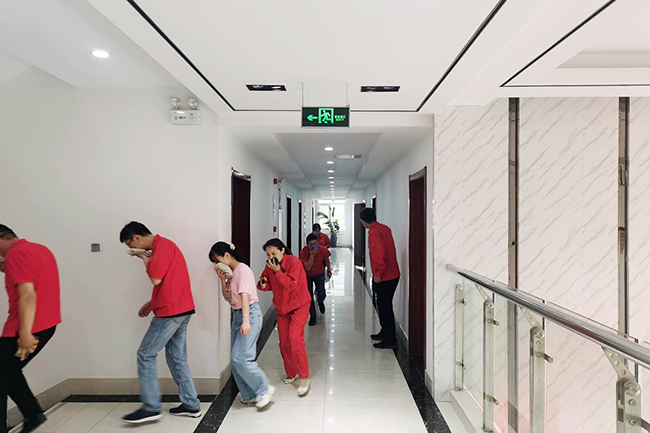 公司首先在辦公樓進(jìn)行了消防疏散演習(xí)。上午8:30,隨著警報(bào)響起,撤離命令第一時(shí)間由專人傳達(dá)至辦公樓每個(gè)在崗員工,大家立即沿著指定路線快速疏散,有序撤離到安全地帶。