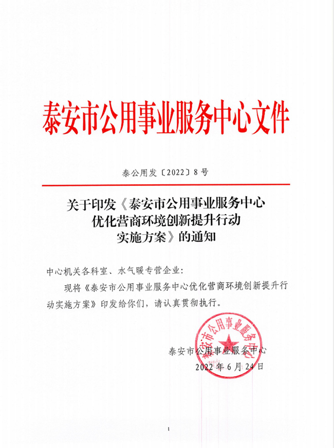 關(guān)于印發(fā)《泰安市公用事業(yè)服務(wù)中心優(yōu)化營商環(huán)境創(chuàng)新提升行動實(shí)施方案》的通知