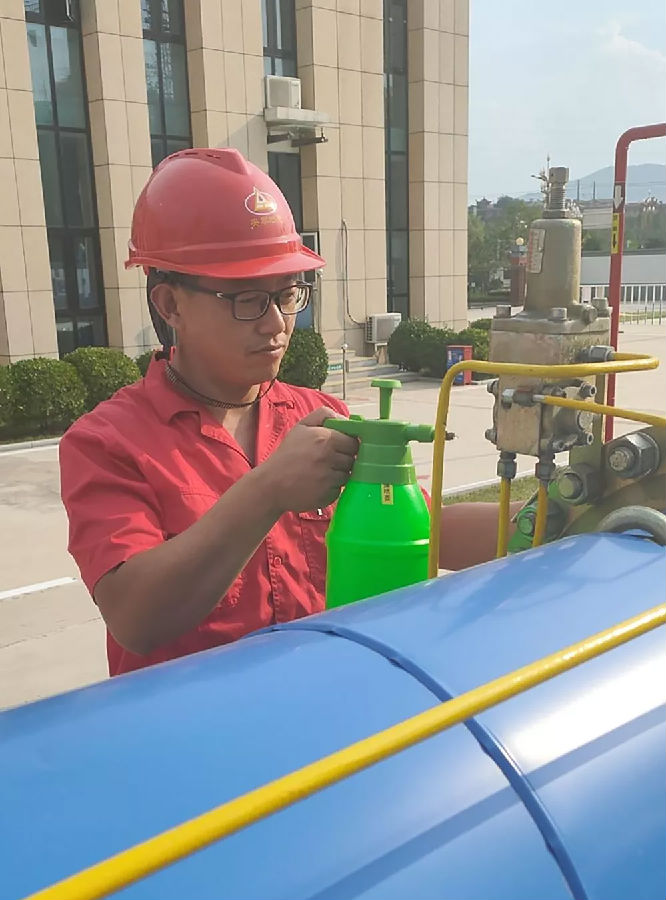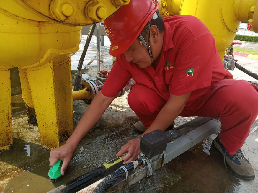 他們的職責(zé)是保障站區(qū)安全平穩(wěn)供氣。在站區(qū)的工藝區(qū),值班人員正在進行日常巡察。烈日之下,他們不放過每一個閥門、接口處,仔細用檢漏液檢測是否漏氣,同時認真記錄數(shù)據(jù)。夏季管道與環(huán)境溫差大,加上氣候潮濕,管道上產(chǎn)生的冷凝水滴落下來,很容易在地面和管道上生成青苔,既影響值班人員操作,又不美觀,存在不安全因素。值班人員時常頂著高溫清理青苔,衣服經(jīng)常濕了干干了濕?!鞍踩ぷ鳑]有小事,任何事都得重視?!痹谒麄兛磥?,日復(fù)一日的守護容不得半點馬虎,時刻保持警惕之心才能讓站區(qū)運行更加穩(wěn)定。